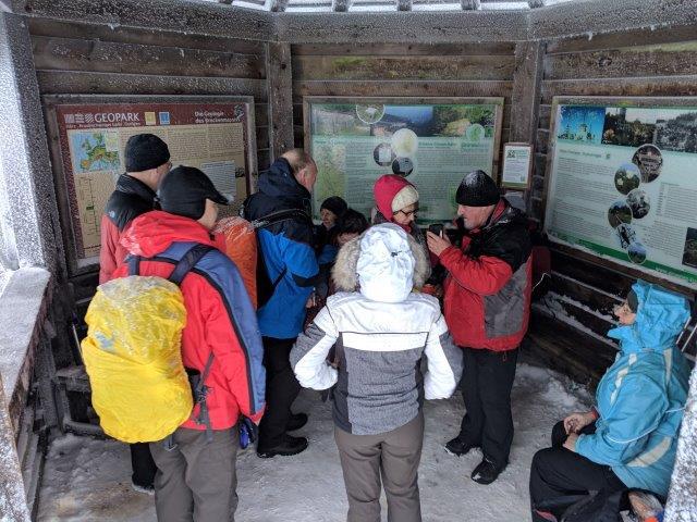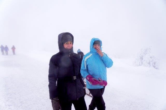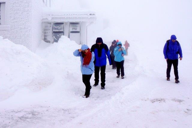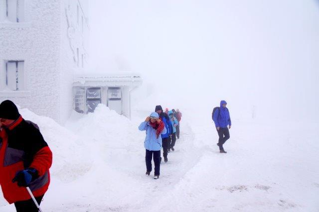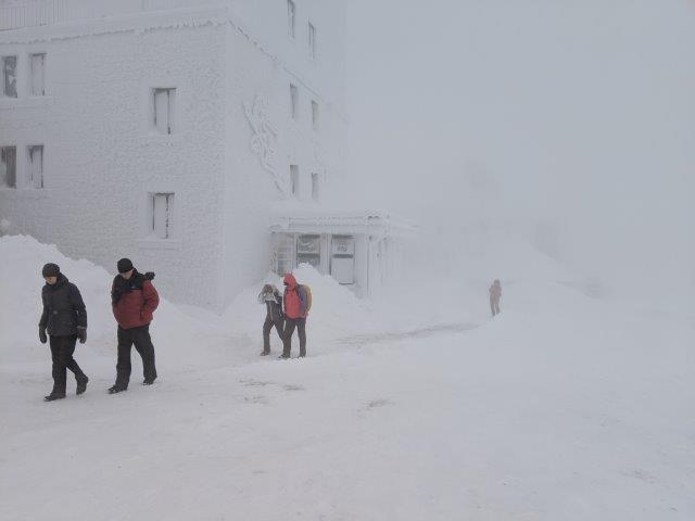 Am nächstern Morgen war der Gipfel so in Nebel gehüllt und vom Sturm umtost, dass wir nach wenigen Schritten umkehren und das obligate Gipfelfoto auf dem unterhalb gelegenen Bahnhof machen mussten.