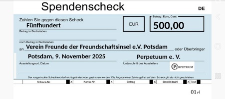 Am 9. November 2025 übergaben wir einen Scheck über 500 € an den Freunde der Freundschaftsinsel e.V.